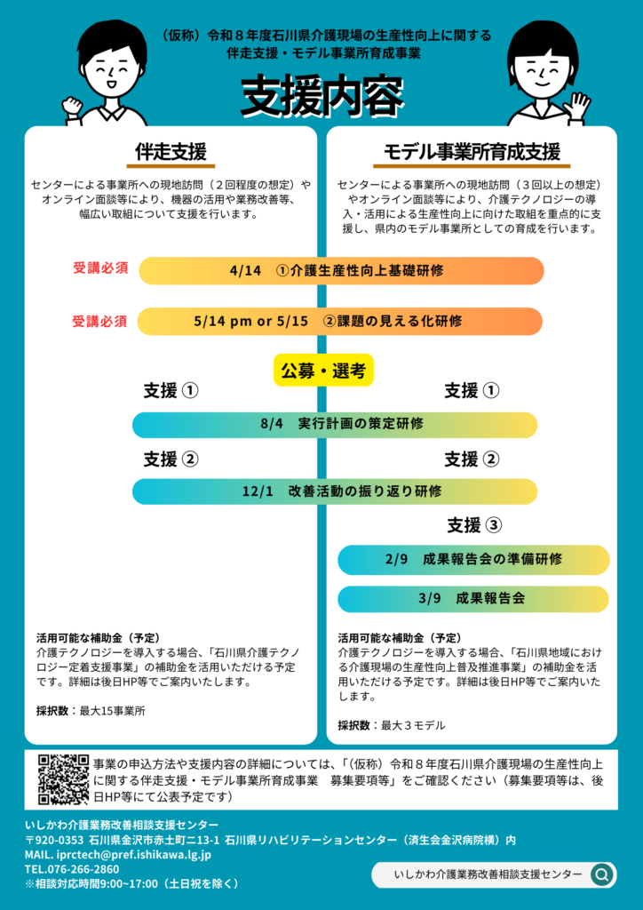 なお、上記、2つの研修の受講(後日オンデマンド視聴を含む)は、今後募集を行う伴走支援事業・モデル事業への参画、および(仮称)石川県介護テクノロジー定着支援事業費補助金の申請要件となる予定です。