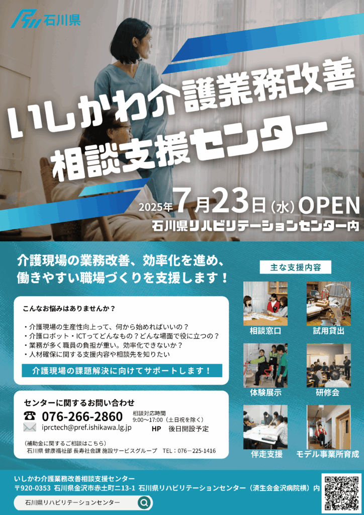 石川県では、介護現場における生産性向上の取組を推進するため、介護サービス事業所等に対してワンストップ型の支援を行う「いしかわ介護業務改善相談支援センター」を、令和7年7月23日(水)にオープンしました。